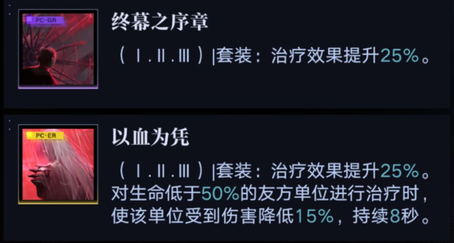 终幕之序章和以血为凭(两者都是三件套),分别是治疗套和大治疗套,泛用于所有奶妈,算是奶妈的毕业套,没有以血为凭也没关系,紫色的治疗套就够用
