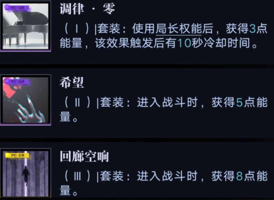 最常见的三件套,调律零(1号位)+希望(2号位)+回廊空响(3号位),俗称能量套,可以在提供13点初始能量+每次使用局长技能给3点能量(有10秒冷却),可以泛用在任何需要开大输出的角色身上,有时候能早点开大远胜于其他乱七八糟的套装加成(尤其是在破碎防线,在主线里也可以减轻初始波次的压力),回廊空响永远不嫌多