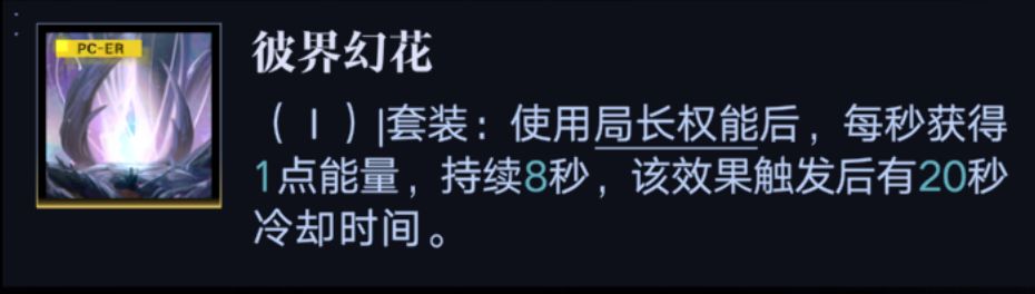 彼界幻花(1号位),大调律零,使用局长技能可以持续回能(8点),冷却时间更长,效果比调律零更好,(可惜只有一个)