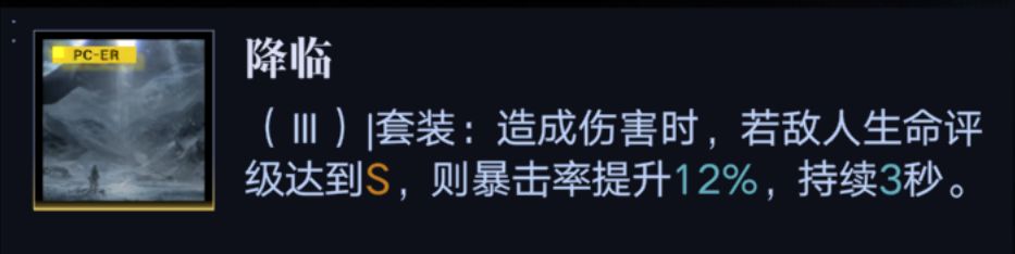 降临(3号位),对生命为s的敌人造成伤害时提高暴击,适合当暴击套的散件