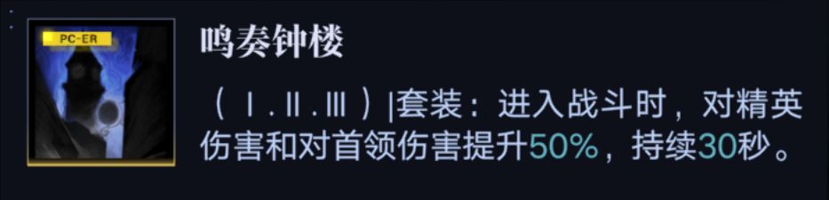 鸣奏钟楼(三件套),俗称钟楼套,提供开局对boss和精英怪50%伤害加成30秒,是破碎防线主c的最优选择(不需要像混沌之拥那样必须破核),如果想打破碎防线高分,几乎必须入手(但只打一个24w保底或者干脆吃次数保底就不需要了,没有其他地方就业)