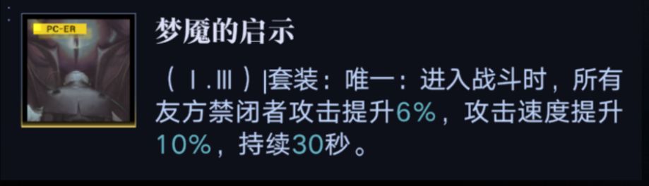 其次,就是梦魇的启示(1、3号位),常搭配希望或者彼身燃星等二号位使用,可以提供开局30秒的攻击、攻速提升,在破碎防线这种竞速环境是非常通用的拐套,该套装不可叠加,所以换一套即可