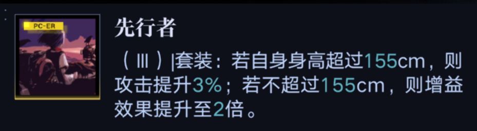 先行者(3号位),根据角色身高提供攻击加成,但就算不够矮,也可以吃到一些加成,算是很不错的输出单件(比深度污染强)