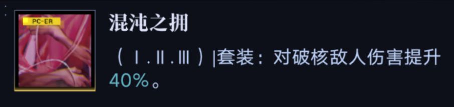混沌之拥可以提供对破核后的怪物40%的增伤,完全独立的乘区,无论是对主线boss、精英怪还是在破碎防线,都拥有极强的加成,加上本身是金色烙印,三号位为攻击加成,就算不打破核的怪,本身面板也很不错,非常适合在烙印不多、且不需要尽早启动的主c使用,绝大部分萌新只要掌握能量套和混沌套就可以基本上横扫90%的烙印搭配了