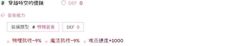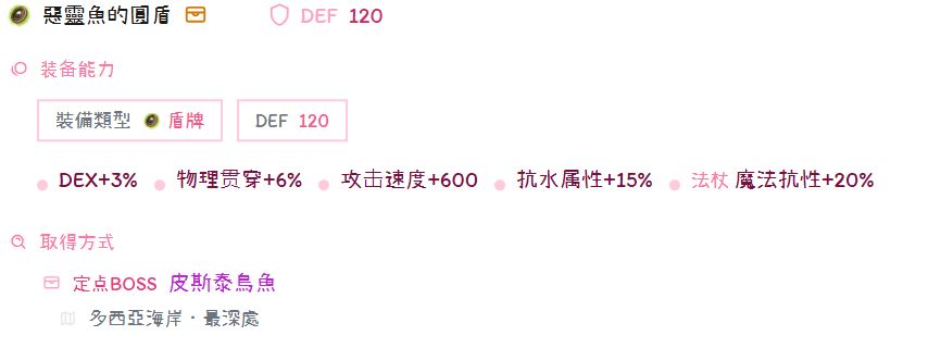 王掉 恶灵鱼的圆盾在于兼顾攻速与命中,根据上面的配装大约提供180命中,+600速比较容易达成万速,多西亚海岸皮鱼破位掉落(破哪我忘了qwq)。同理还有个圣诞限定的精灵盾加1000攻速如果你有也可选,但是不带命中。