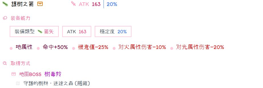 护树箭好处在于加50%命中,约等于400命中,是命中最高的副手。获取方式在迷途之森走迷宫,走两次中间到达野王所在地,击杀野王有概率掉落