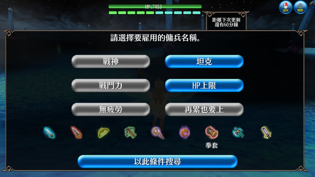 进入搜寻页面后,勾选 坦克 HP上限 拳套 然后点击以此条件搜寻