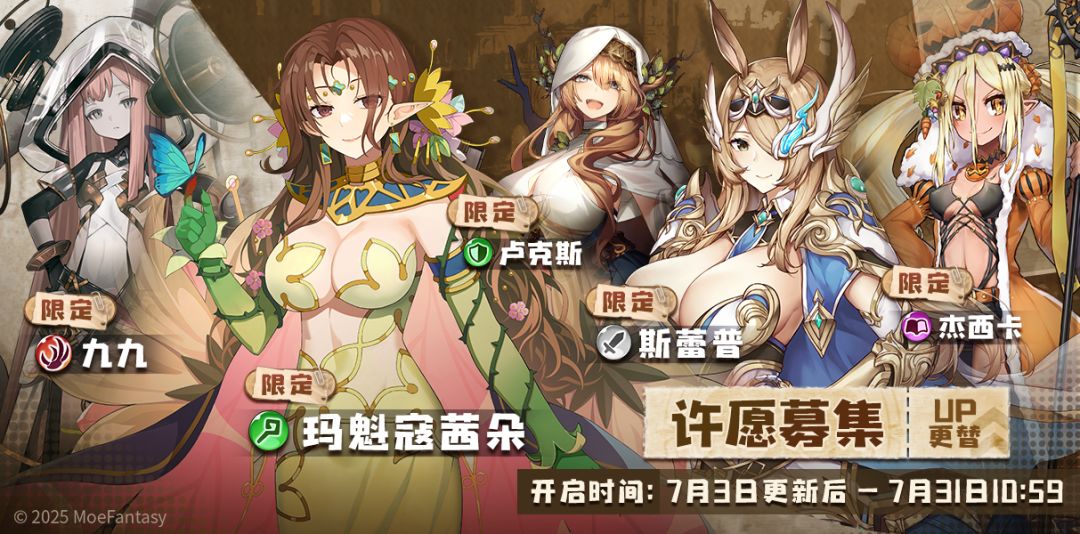 许愿角色:玛魁寇茜朵【限定·new】、九九【限定】、卢克斯【限定】、斯蕾普【限定】、杰西卡【限定】