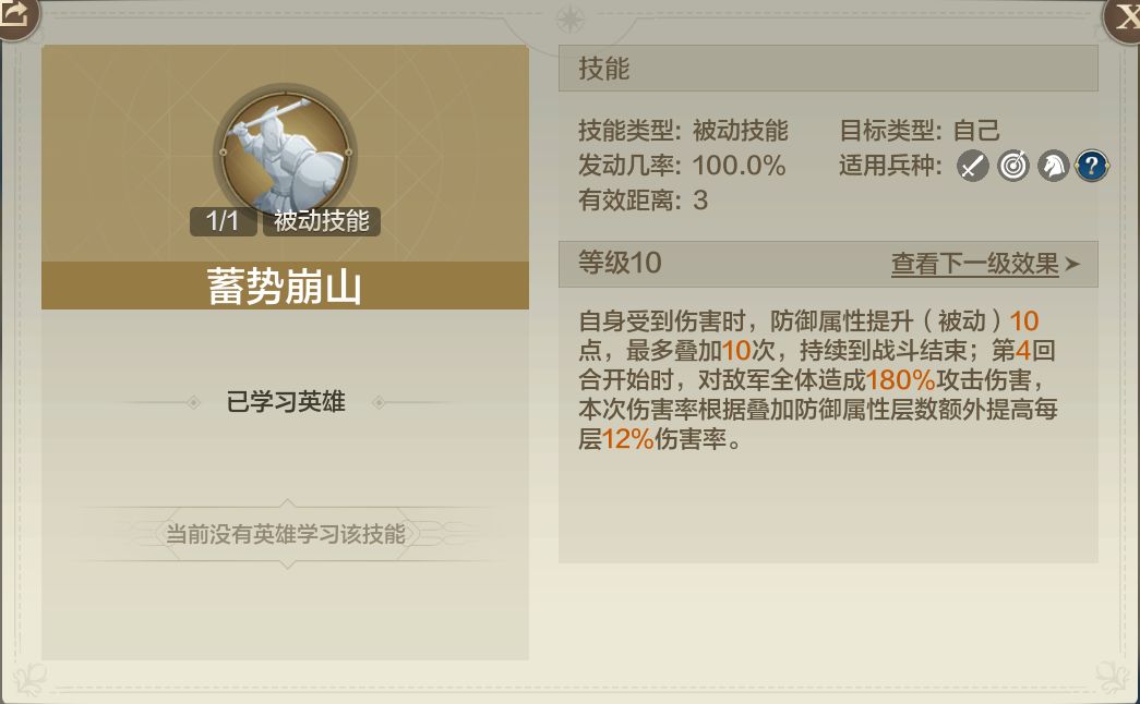 自身受到伤害时,防御属性提升(被动)10点,最多叠加10次,持续到战斗结束;第4回合开始时,对敌军全体造成180%攻击伤害,本次伤害率根据叠加防御属性层数额外提高每层12%伤害率。