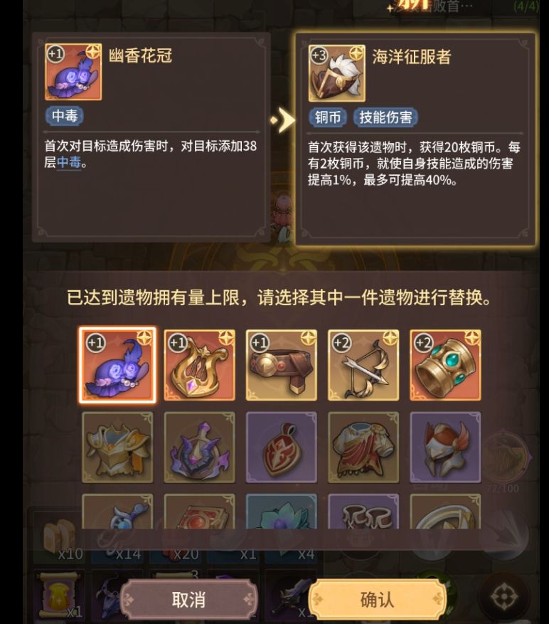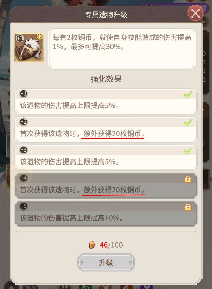 但是如果你关注角色遗物效果,你会发现莫莉遗物升级后,会附加一个“获得遗物后能送一定数量铜币”的效果,而每个区域结束后,我们能摸一次时光宝库。当你的英雄专属遗物格子满了以后,这个时候,你可以拿一个莫莉的专属遗物,直接就能白嫖铜币。