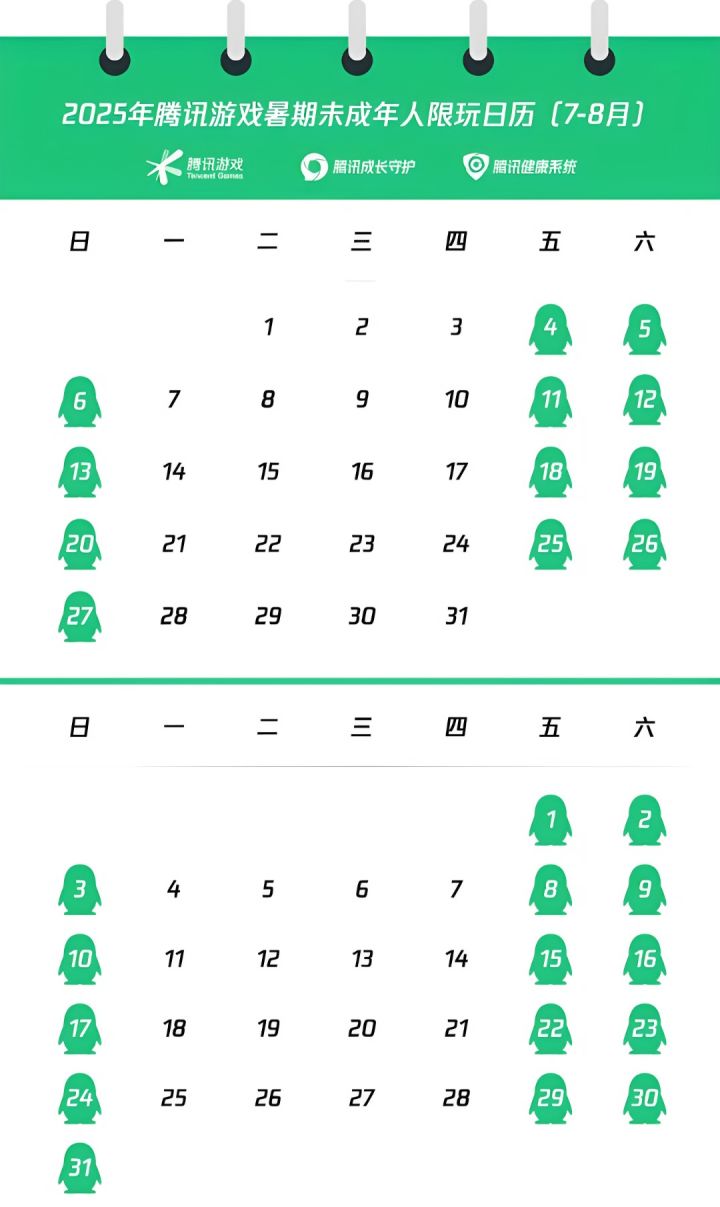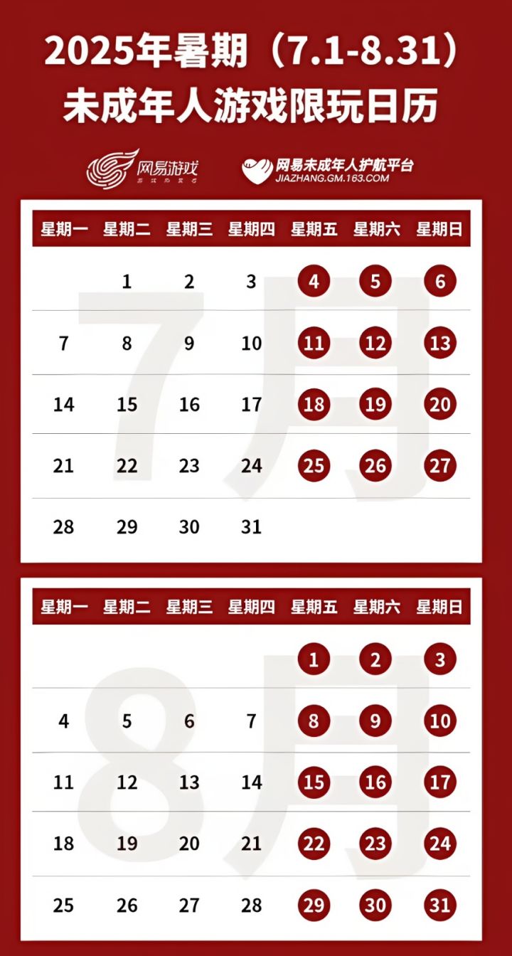 网易游戏、腾讯游戏分别发布了 2025 年暑期未成年人限玩日历(7 月 1 日 - 8 月 31 日):暑假期间,未成年人仅可在每周五、六、日晚间 20 时至 21 时登录游戏,每周游戏时长控制在 3 小时内,整个暑假总计 时长不超过27 小时。
