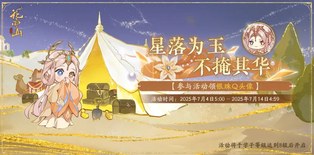 活动说明:活动期间,学子完成每日/累计任务,可获得花诏令、金叶子、银纹玉樱、朝华明珠等奖励,累计消耗体力达到指定数目还可领取【银朱Q头像】,详细活动规则可见游戏内说明。
