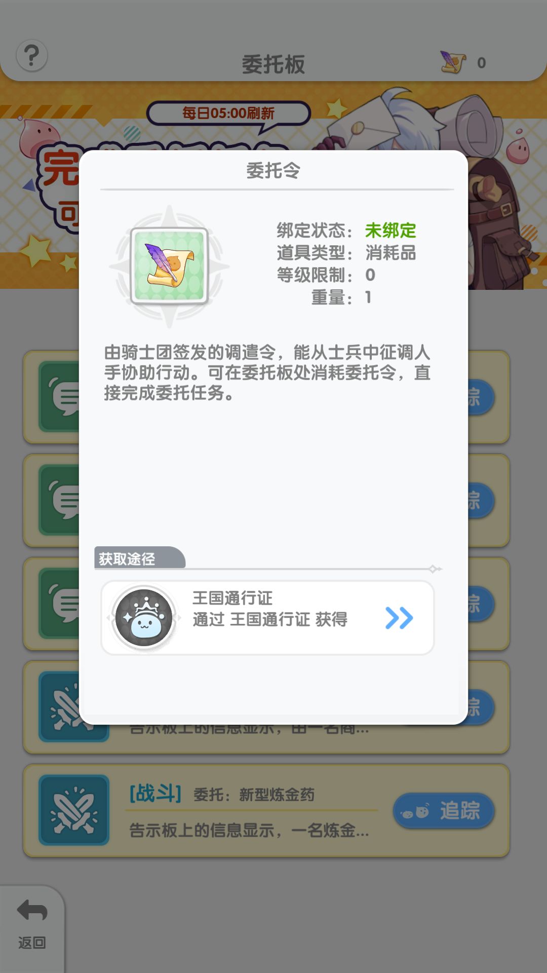 2.委托任务,可以手动接取来完成。当然有些初心者如果没有时间做任务或者小懒(就像小编一样,嘻嘻~)也没事,可以使用委托令(通过王国通行证获得)直接完成任务哦~~