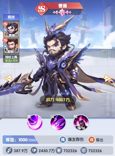 [9星激活]:敌方每减员1人,曹操攻击伤害额外+25%(如敌方剩3人,总加成75%)。这就表示,在人数越少的时候爆发越强,是能让终结战局质变的能力!高压群攻伤害也会使得在pvp战场中迫使敌方优先保护低血量武将,否则越打伤害越失控。也会让收割链得到强化,配合群攻武将先手减员,可瞬间叠出100%+伤害增幅,形成「破局→斩杀→碾压」循环。