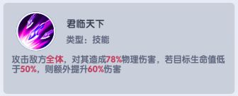 技能【君临天下】:曹操对全体敌方造成78%物理伤害,若目标血量低于50%,伤害额外提升60%(总伤约125%)。此技能是群体压血线核心技,快速压低敌方全员状态,并且曹操可以当做为残血收割利器,对半血以下目标造成毁灭打击。若是战术协同性强,可配合其他武将集火触发斩杀效果,形成战场滚雪球优势。