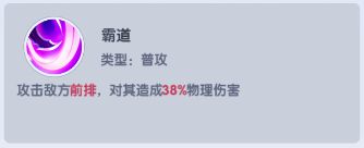普攻【霸道】:攻击敌方前排,对其造成38%物理伤害。