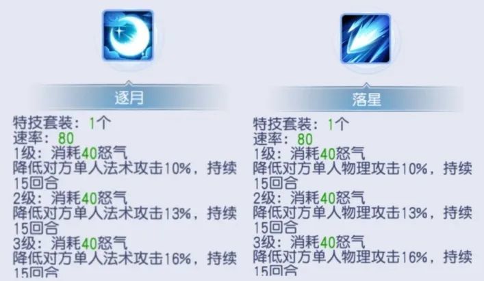 再看特技驻月和落星,分别针对物理和法术,二级效果降低13%,和铁扇仙子扇火差距不大,但需要辅助职业、40愤怒和特技位置。今天咱们就用铁扇仙子替代这两个特技。