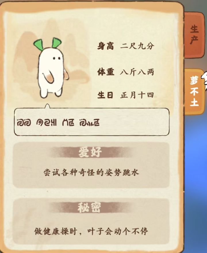 萝的能力:注意!萝不土扔出的矿料会把胡萝卜砸晕哦!每扔出两次原始土就会扔出一次矿料,并使胡萝卜产生3s的眩晕效果。