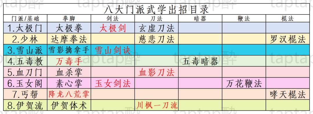我想大家也不想到处找帖子,直接整理出整洁利落的武学招式情况汇总应该也是比较方便的,就以表格的形式供大家观看,有需要的可以取图慢慢看。