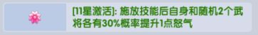 释放技能后,稳定为自身+随机2名武将回1点怒气(联动11星概率回怒)。