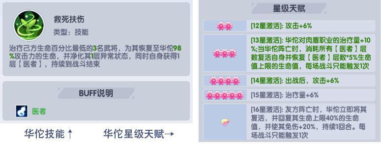 华佗在4号位的华佗对队友进行净化、避免5号和6号因为异常状态不能出手,也为队友提供治疗来触发黄月英的天赋效果,也为自身叠加医者被动,由于自身自带复活效果也能为队友提供更好的站场效果。