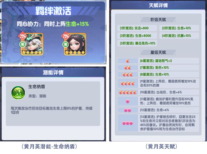 羁绊:同时上阵生命+15%诸葛亮在升到18星后为全体友方提供的治疗能够触发潜能的护盾能够跟黄月英的天赋进行联动,提供更多的增伤和治疗。