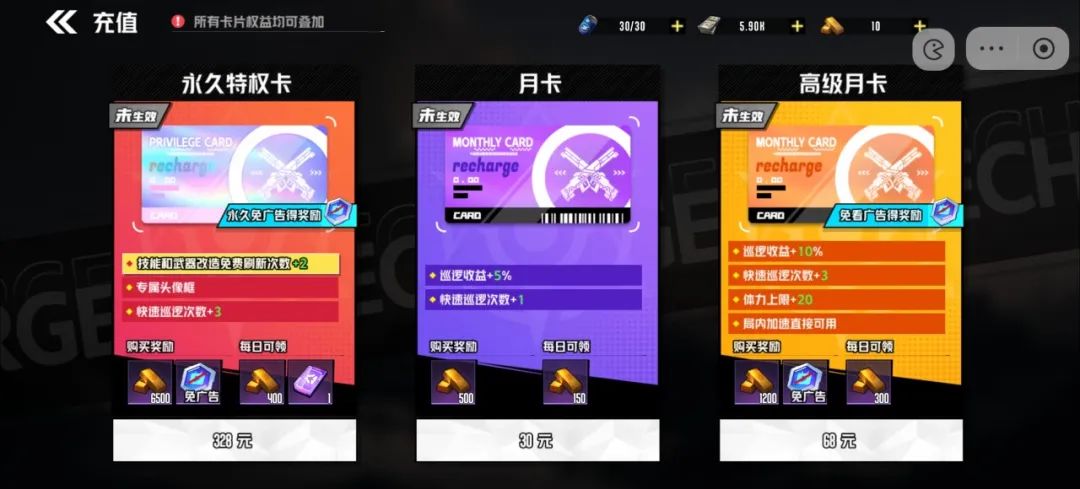 PS:可累计三种特权卡购买,同时生效,购买后每日可通过特权卡界面领取每日奖励