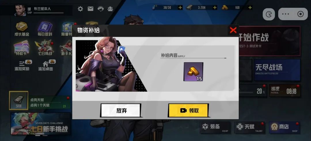 主界面隔一段时间会刷出一个物资补给箱,物资内容随机刷新,通过观看广告即可获得物资,概率刷出金砖~