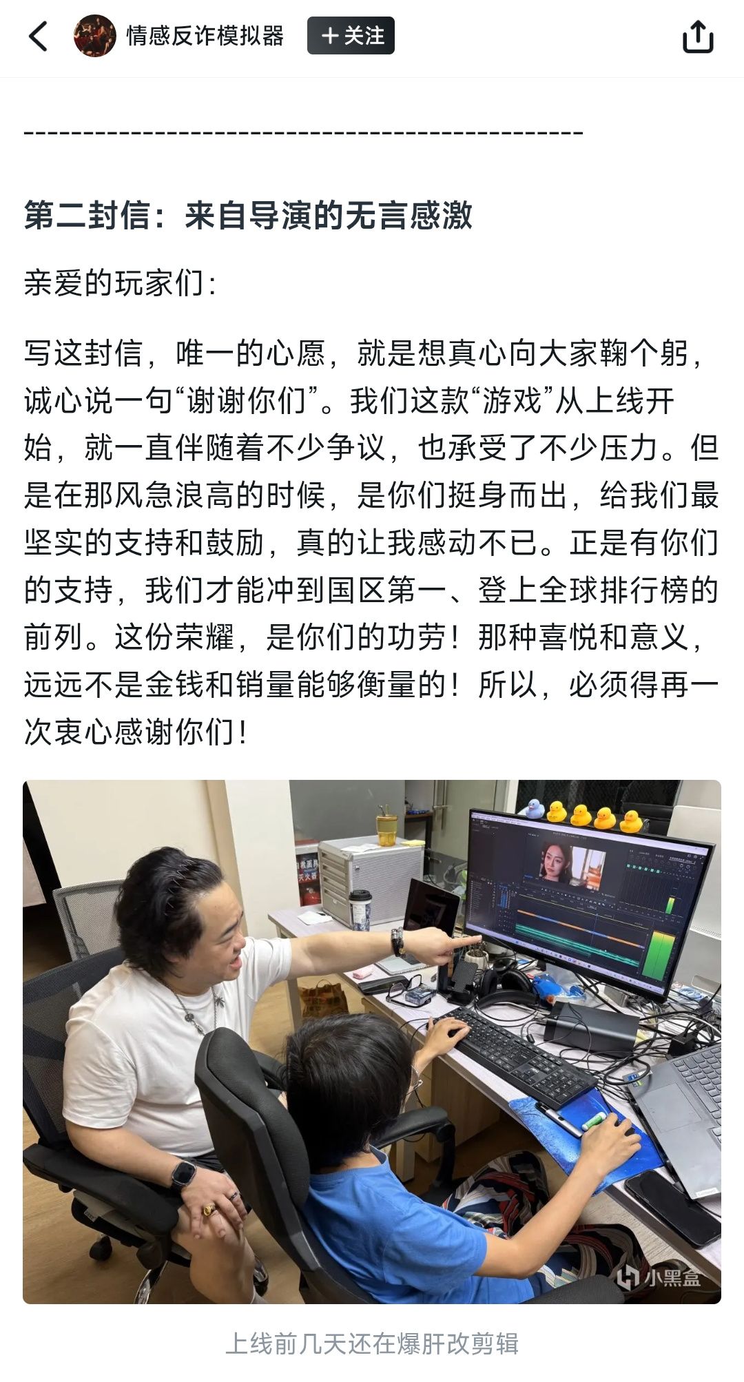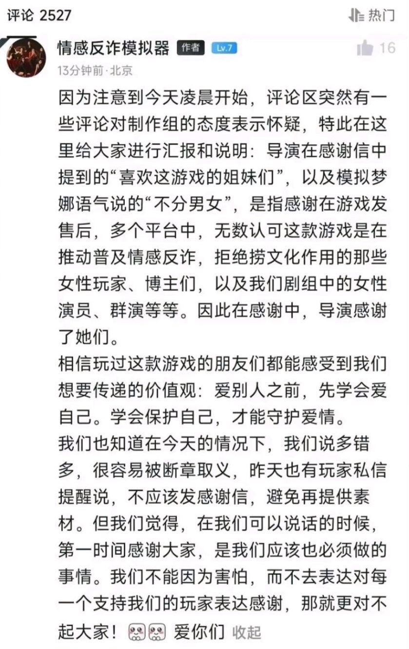 近日,《#情感反诈模拟器#》(原《#捞女游戏#》)制作组在游戏社区发布了一封感谢信,游戏制作人木飞、导演胡耀辉、“陈欣欣”演员刘梦茹分别在信中表达了自己的感想和对玩家的感激(图1-图2)。然而导演胡耀辉在信中因为一些言语措辞问题,引发玩家质疑“分不清谁才是真正应该感谢的”(图3)并纷纷在Steam打下差评或申请退款。#情感反诈模拟器导演道歉#
