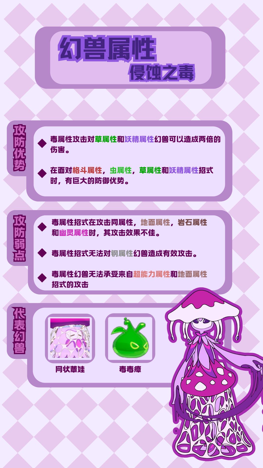 在《口袋新旅途》中,网状蕈娃和毒毒瘴作为侵蚀之毒属性的代表幻兽,不仅拥有独特的外形,更具备强大的战斗能力。网状蕈娃那梦幻般的紫色外观,搭配上神秘的纹路,让人一眼就难以忘怀。它在战斗中能够灵活运用毒属性的优势,释放出各种强力的毒系招式,对草属性和妖精属性的对手造成致命打击。