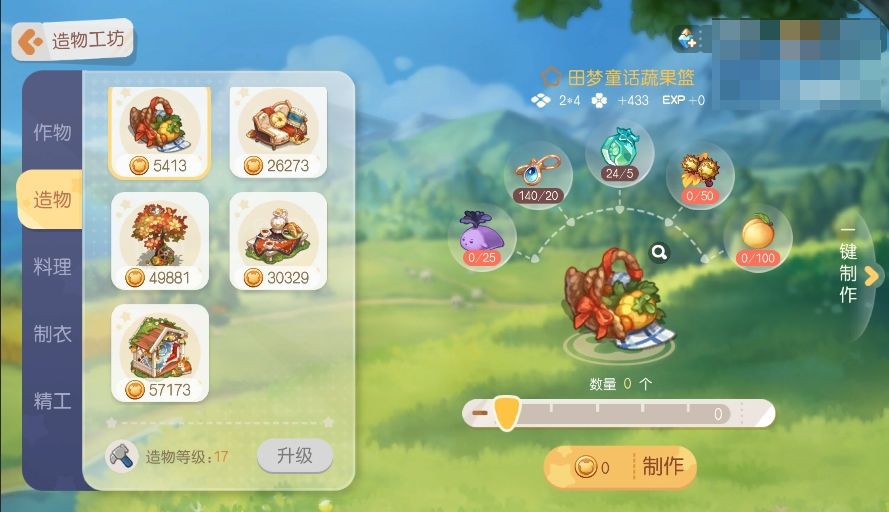 活动介绍:版本更新后,造物工坊、料理工坊、制衣工坊、精工工坊将更新新制作。制衣工坊将更新全新晨星品质男装「牧野追梦套装」、晨星品质女装「田园童话套装」,造物工坊&精工工坊将更新晨星品质家具「田梦童话」系列,小奥比们快来体验新内容吧!