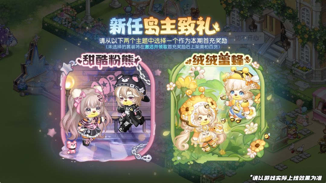 活动介绍: 版本更新后, 岛内将更新两个主题首充活动的装扮类奖励(可染色),小奥比们累计充值满6元即可激活首充活动,从两个主题中选择一个作为本期首充奖励!未选择的主题套装将在激活并领取首充奖励后上架奥柏百货,喜欢的小奥比们不要错过!