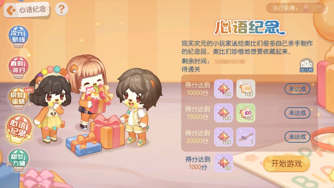 活动介绍:今年的周年庆蛋糕,温蒂似乎又有了新想法,快来协助她一起制作周年蛋糕吧!小奥比们在制作周年庆蛋糕的过程中可获得「三周年次元蛋糕」、「时空之钥」等奖励,当蛋糕完成后,小奥比们每天吃蛋糕可获得「晶钻*40」,可持续七天,七天后还可获得「庆典蛋糕嘟嘟乐」家具。