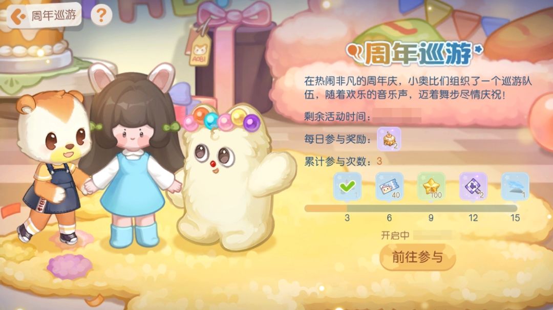 活动介绍:在热闹非凡的周年庆,小奥比们组织了一个巡游队伍,随着欢乐的音乐声,迈着舞步尽情庆祝吧!活动时间内,每晚19:00-23:00期间「异次元卧室」场景中将开启周年巡游活动。届时小奥比们可在「异次元卧室」中寻找引领巡游队伍的NPC,点击"参与巡游"加入巡游队伍。每日参与巡游可获得奖励哦!