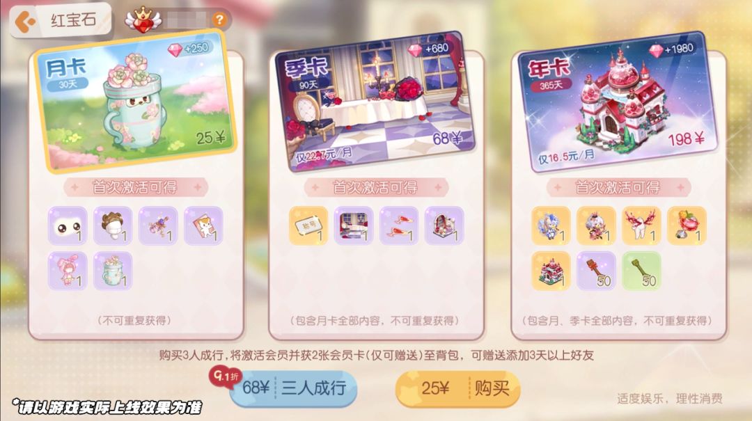 活动介绍:版本更新后,岛内将更新红宝石月卡、季卡、年卡的装扮类奖励。 新增红宝石特权:批量提交订单、增加海底宝箱获得捕鱼材料数量+1、增加捕鱼获得捕鱼材料数量+1、捕鱼基础成功率+0.1%倍、挖矿冷却时间缩减20%、采集木材冷却时间缩减20%。