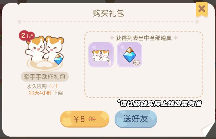 活动介绍:「牵手手动作礼包」限时上架,购买可获得「牵手手」动作和「晶钻」奖励,喜欢的小奥比们快快行动吧!