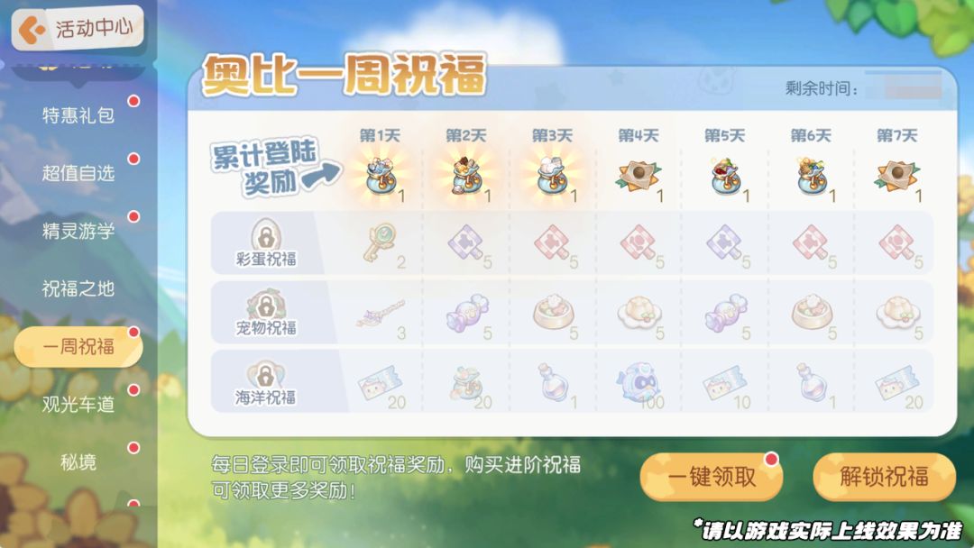 活动介绍:活动期间内,小奥比们通过每日登录即可领取7日祝福奖励。购买进阶祝福(本次含:彩蛋祝福/宠物祝福/海洋祝福),还可获得对应祝福的更多奖励哟!