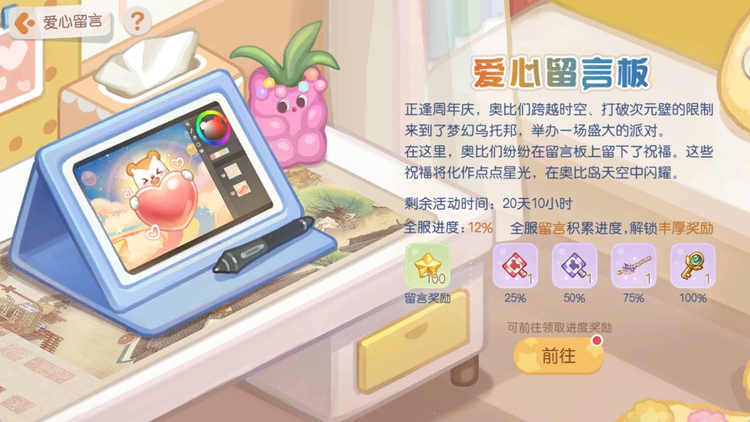 活动介绍:活动期间,小奥比们可以在留言板上写下自己对周年庆的祝福,并获得留言奖励。当全服留言数量达到指定进度时,会解锁对应的进度奖励哦, 快来派对留言板中留下你的祝福吧!