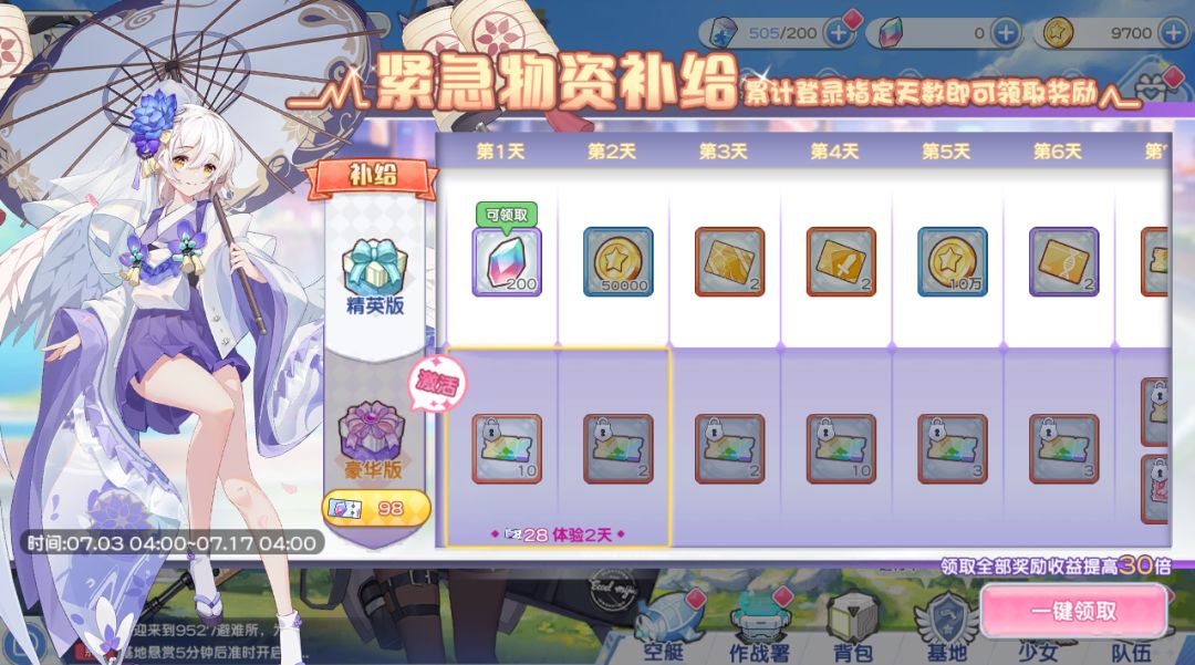 亲爱的指挥官,全新登录补给活动即将来临,活动期间连续登录即可领取相应奖励,激活豪华补给更可额外获取稀有道具奖励~