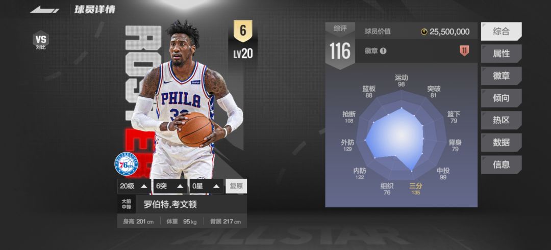 作为一个合格的3D球员,首先要有合格的三分能力,17版考文顿拥有135的三分属性加上铜接球和定点射手两大徽章,配上丝滑的投篮包和双底角热区,往底角一蹲就能为团队提供强力的外线火力。