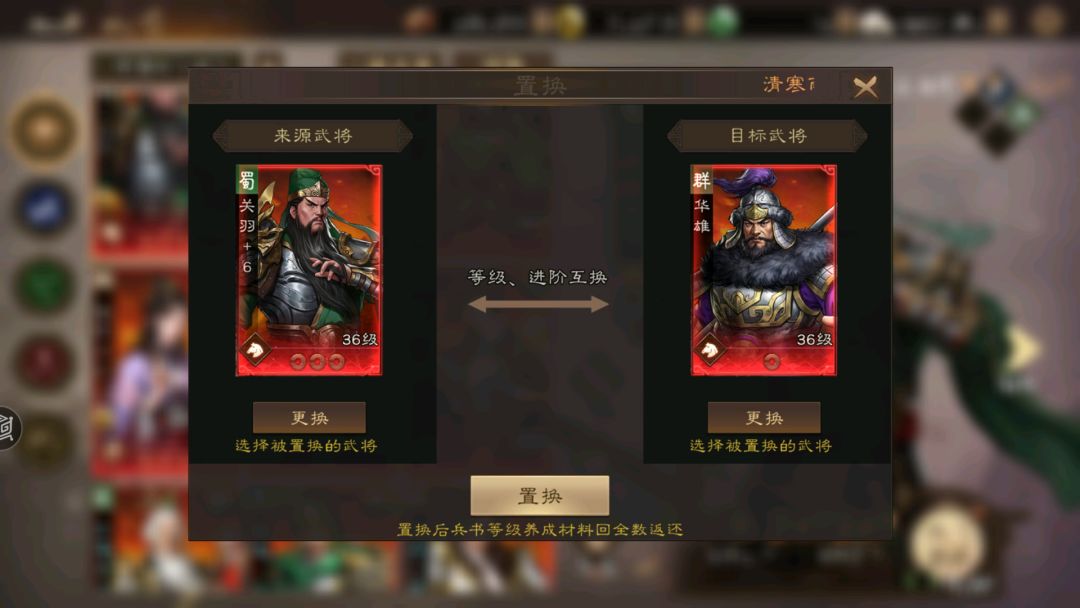 不用怕吃掉浪费,我们可以利用武将界面的“置换”,将已经吃掉的兵书经验,再返还回来