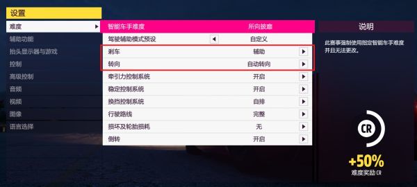 难度关键设置刹车设置为“辅助”,转向设置为“自动转向”。