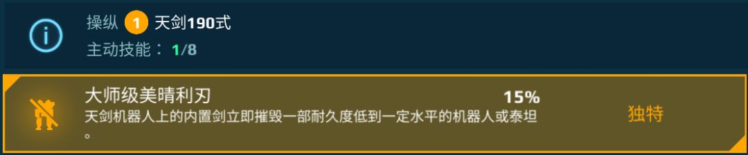 或是为“天剑”系列机甲搭载,只要其配备了机师[夏普美晴],开启了技能“大师级美晴利刃”,即可在目标耐久值低于15%时触发斩杀,直接摧毁目标单位。