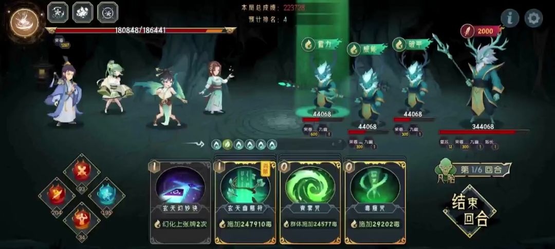 第一回合:云中子打出百转叠浪诀、三清化水符和玄冰化刃符,吕风复制玄冰化刃符并打出,柳盈打出玄冰神破、玄冰九变和化刃符,此时如果两张牌能秒掉大怪就直接出手,如果秒不掉就等下回合。