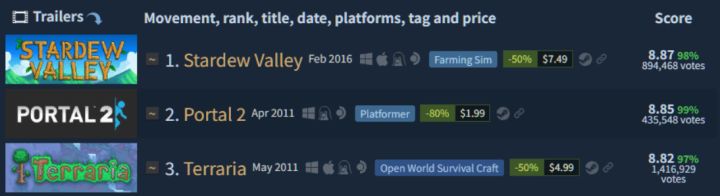 据 Steam250 统计数据显示,《星露谷物语》以微弱优势超越 V 社经典《传送门 2》,登顶 Steam 平台最受欢迎游戏榜单。该排名综合评论数与好评率计算:《星露谷物语》累计近 90 万条评测(超《传送门 2》两倍),好评率 98%,综合评分 8.87;《传送门 2》虽以 99% 好评率紧随其后,但因评论量较少屈居第二。