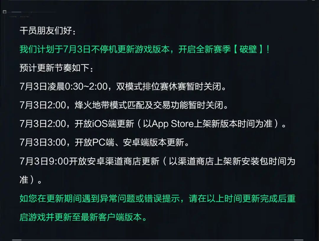 另外3点开始PC和安卓就可以更新了(冲刺3*3的猛攻队,咖啡红牛小零食都备好了吗?)