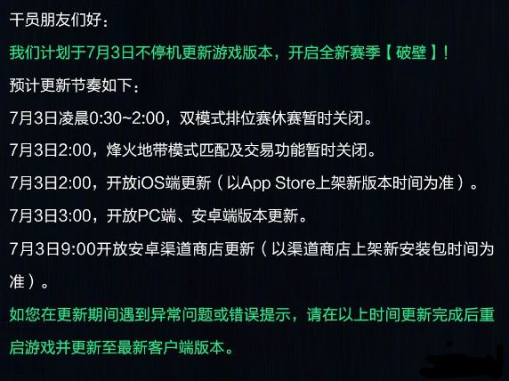 就在刚刚三角洲官方终于发了新赛季公告将在7月3号进行更新。