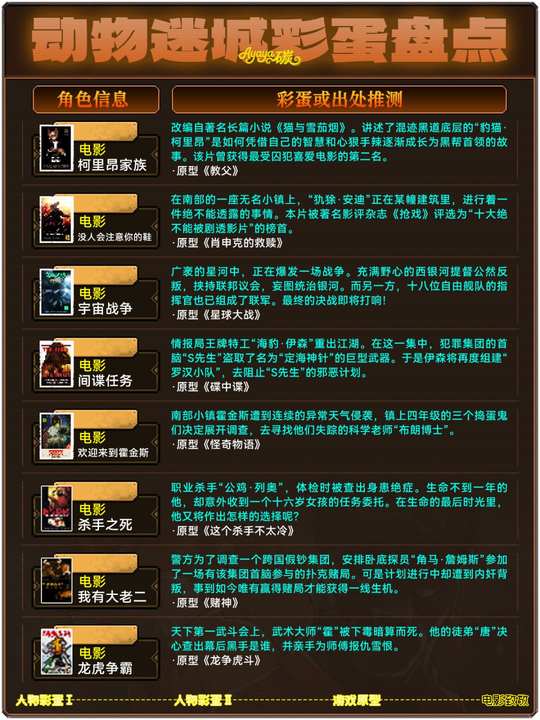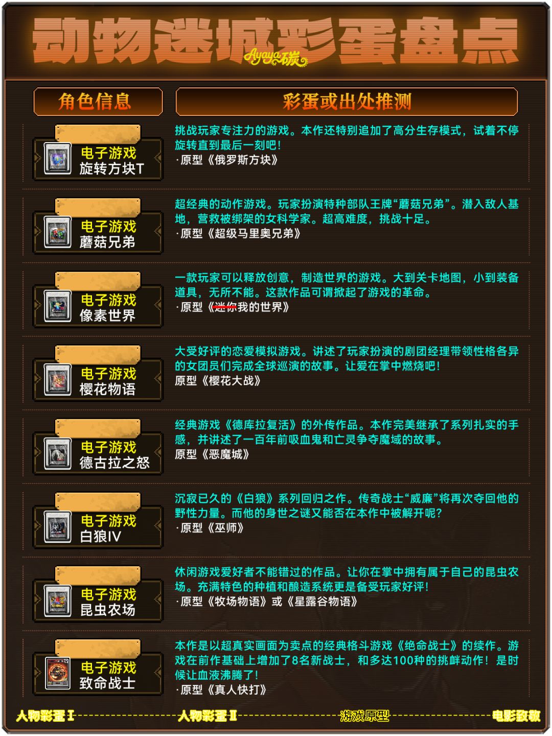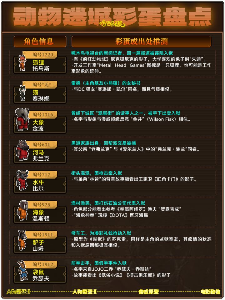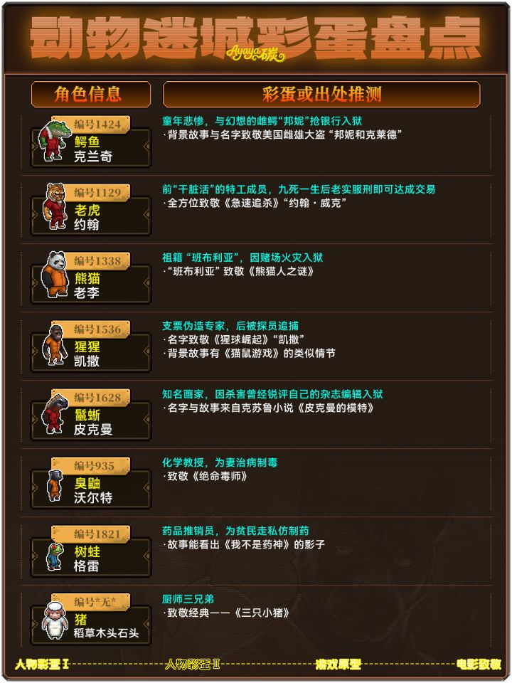 盘点了一下《动物迷城》中游戏的彩蛋和致敬元素,其实玩过的大家应该也都能感知出来一些物品和角色是不一般的~我这里也捋了一下,可能不是最全的但也差不多了!