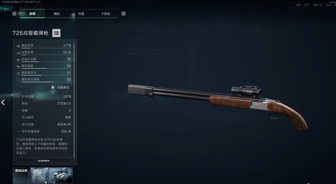 3、反杀概率高,如果你是步枪和冲锋枪,对面的护甲和血量都比你高,无掩体的对枪就是消耗战,你的状态差一定会比他先死,但如果你是725双管,只要你枪不歪,再好的状态也能两枪带走,很容易打出丝血反杀满血。
