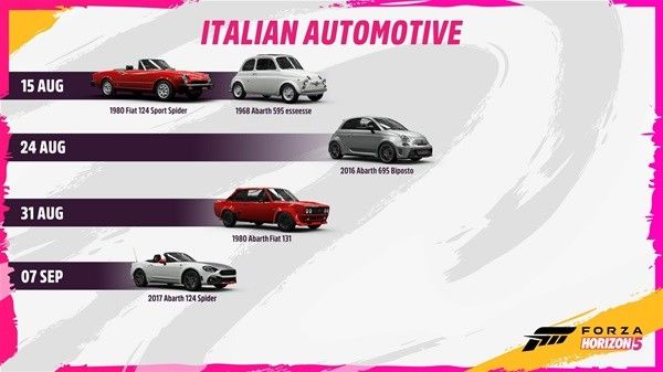 呼唤所有意大利汽车的粉丝,这次更新是专门为你们准备的:阿巴斯(Abarth)、阿尔法·罗密欧(Alfa Romeo)、菲亚特(Fiat)和蓝旗亚(Lancia)将会在我们《极限竞速:地平线 5》有史以来最大规模的汽车更新中回归!我们为您的车库添置了 16 辆汽车,准备好体验意大利汽车的卓越性能。其中有 8 辆汽车可以在 8 月 15 日(星期二)开始的汽车展上立即获得,还有 8 辆汽车可以在接下来的四周内(从 8 月 17 日星期四开始,一直持续到 2023 年 9 月 14 日)通过意大利汽车节节目单表进行解锁。